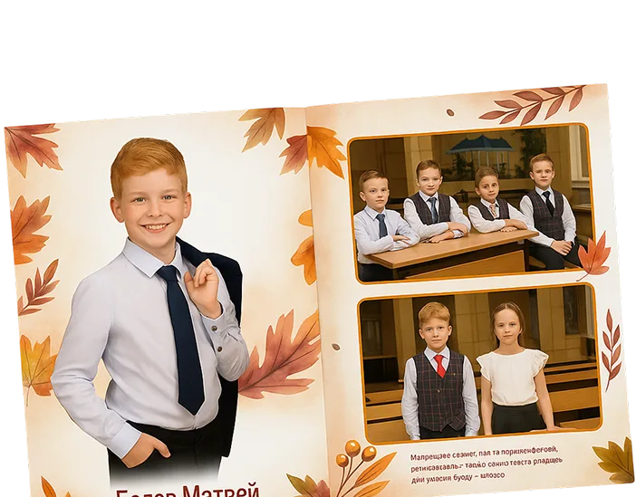 В каталоге студии представлено девять видов оформления выпускных альбомов — от «Произведения» до «Эксклюзива» (примеры готовых работ есть на сайте). Каждый макет включает портрет выпускника, групповое фото класса и снимок классного руководителя (учителя). По желанию можно обсудить индивидуальный дизайн, чтобы найти нужное для клиента решение.